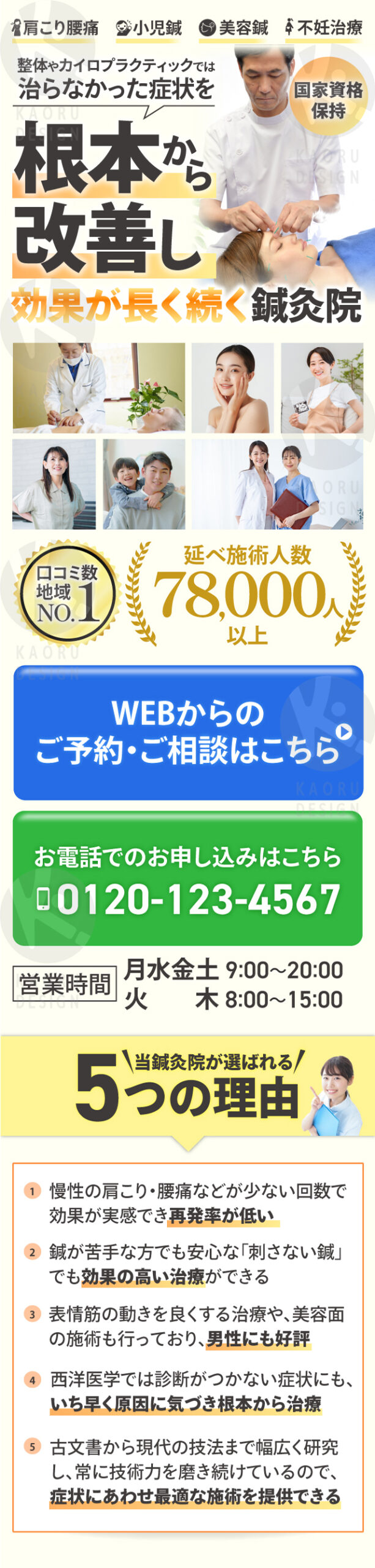 目的: 整体やカイロプラティックで改善しなかった症状を持つ人に問い合わせしていただくためのLP