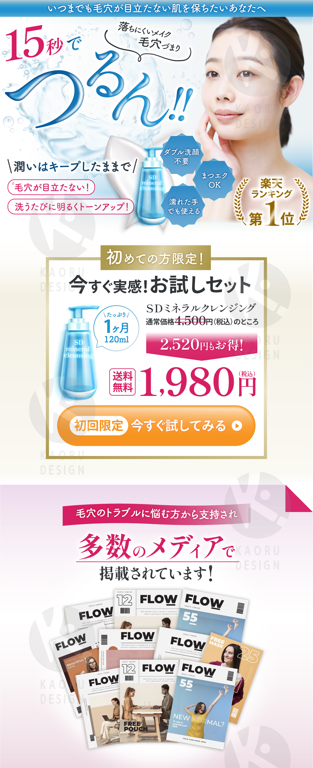 目的: 一瞬でメイクを落とすことができること以外にもいろんなベネフィットがあることをMVで示し、初回限定で今すぐ試してもらうためのLP