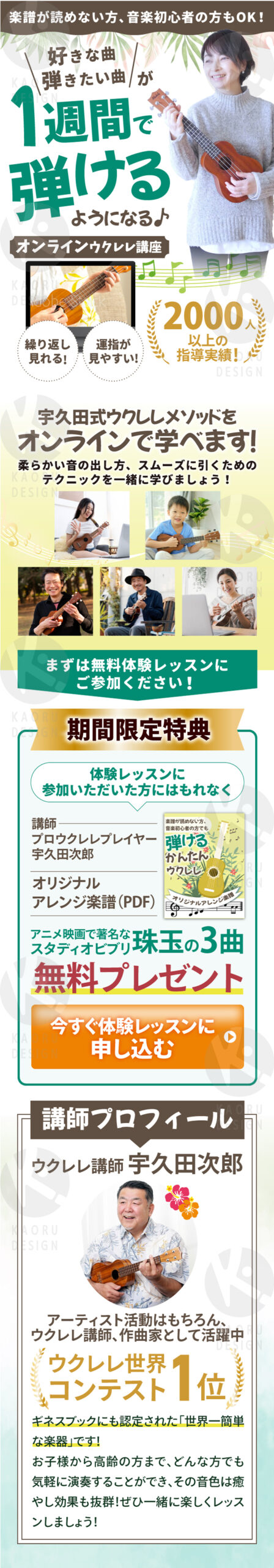 目的: 短期間でウクレレで自分の弾きたい曲が弾けるようになるベネフィットを打ち出してそのための体験レッスンに申し込みをしたLP