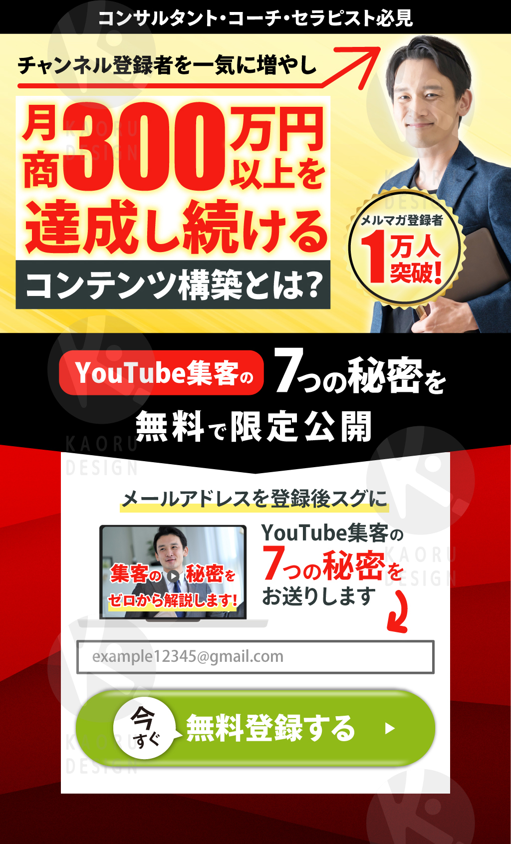 目的: Youtube集客に悩む方に無料で集客解説動画を送る特典を示し、見込み客を集めるLP